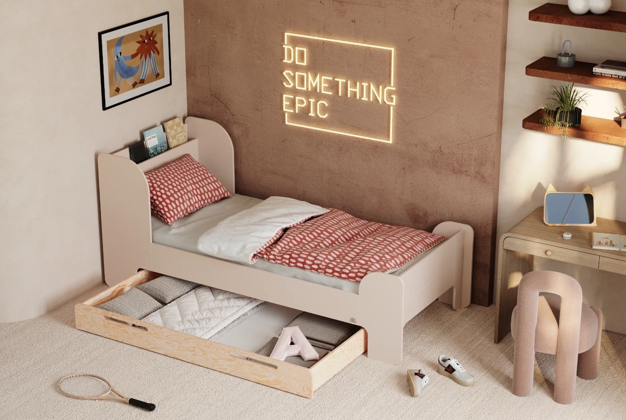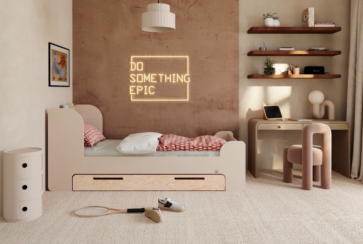 Masz dość nudnych mebli? Nasze łóżko to połączenie solidnej sklejki sosnowej z młodzieżowym vibe’em. Gładkie, zaokrąglone krawędzie chronią przed otarciami, a stonowana estetyka wpasuje się w każdy nastoletni pokój.
