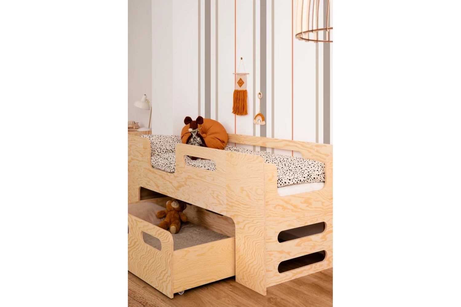 Łóżko PIPI to praktyczne i funkcjonalne rozwiązanie dla Twojego dziecka. Wykonane z wysokiej jakości sklejki sosnowej, która dzięki poddaniu odpowiednim procesom szlifowania, jest gładka i bezpieczna dla dziecięcych rączek. Dostępne w 11 kolorach i 13 rozmiarach, pozwala na elastyczną aranżację pokoju. Świetnie sprawdzi się zarówno dla młodszych, jak i starszych dzieci. Szuflada na gumowych kółkach może pełnić funkcję dodatkowego miejsca do spania lub przestrzeni do przechowywania. Zestaw zawiera stelaż, o max. obciążeniu do 230 kg, dzięki czemu łóżko jest gotowe do użytku od razu po złożeniu. Model ten to połączenie unikatowego designu, funkcjonalności i bezpieczeństwa. Spełnia rygorystyczne normy bezpieczeństwa, zapewniając komfortowy i spokojny sen Twojego dziecka.