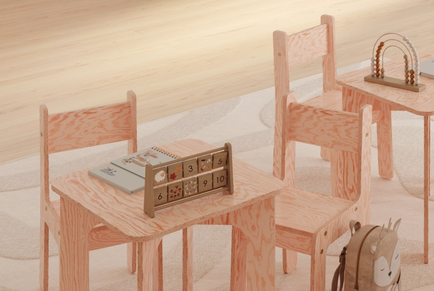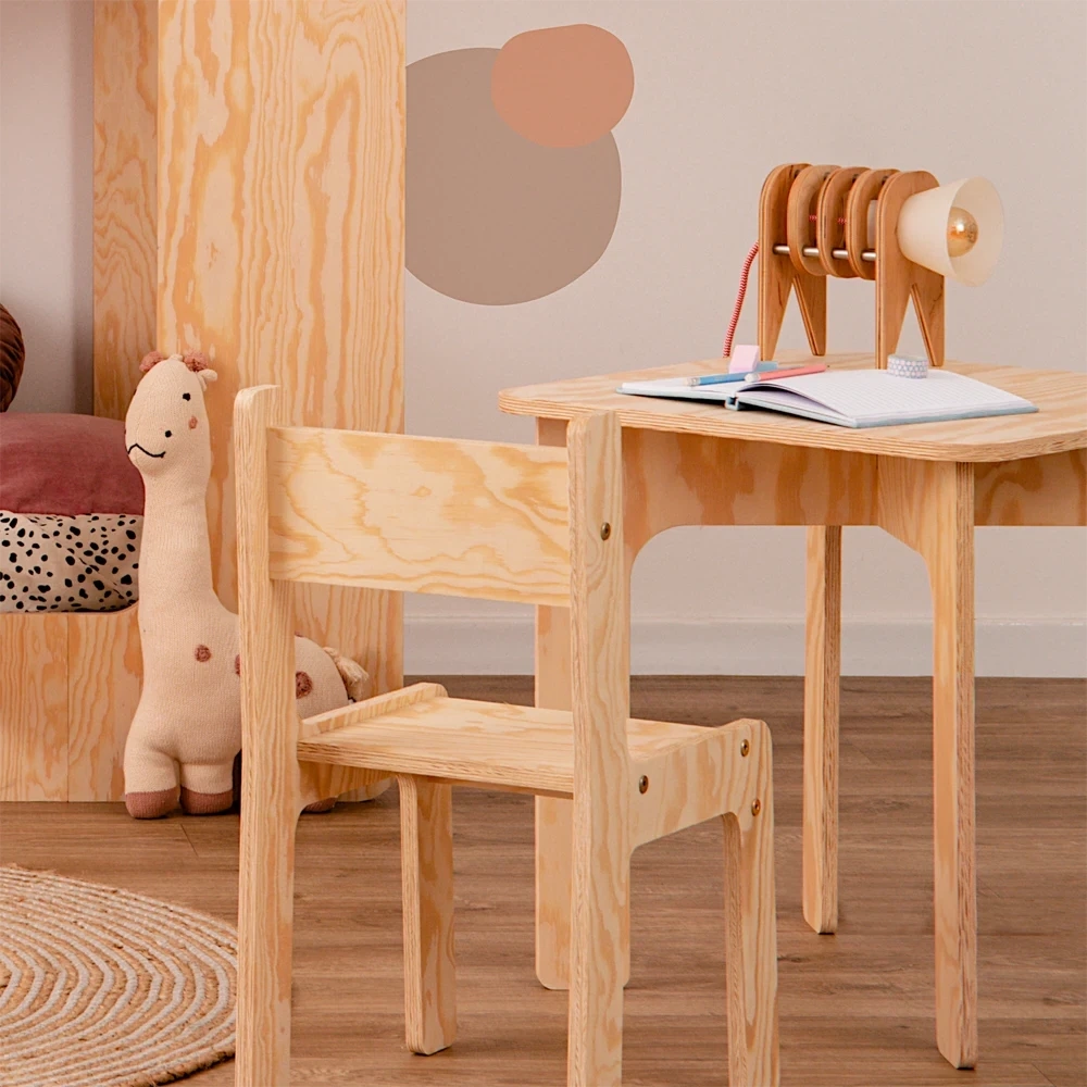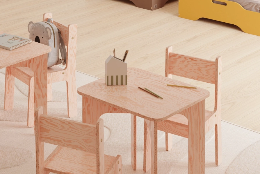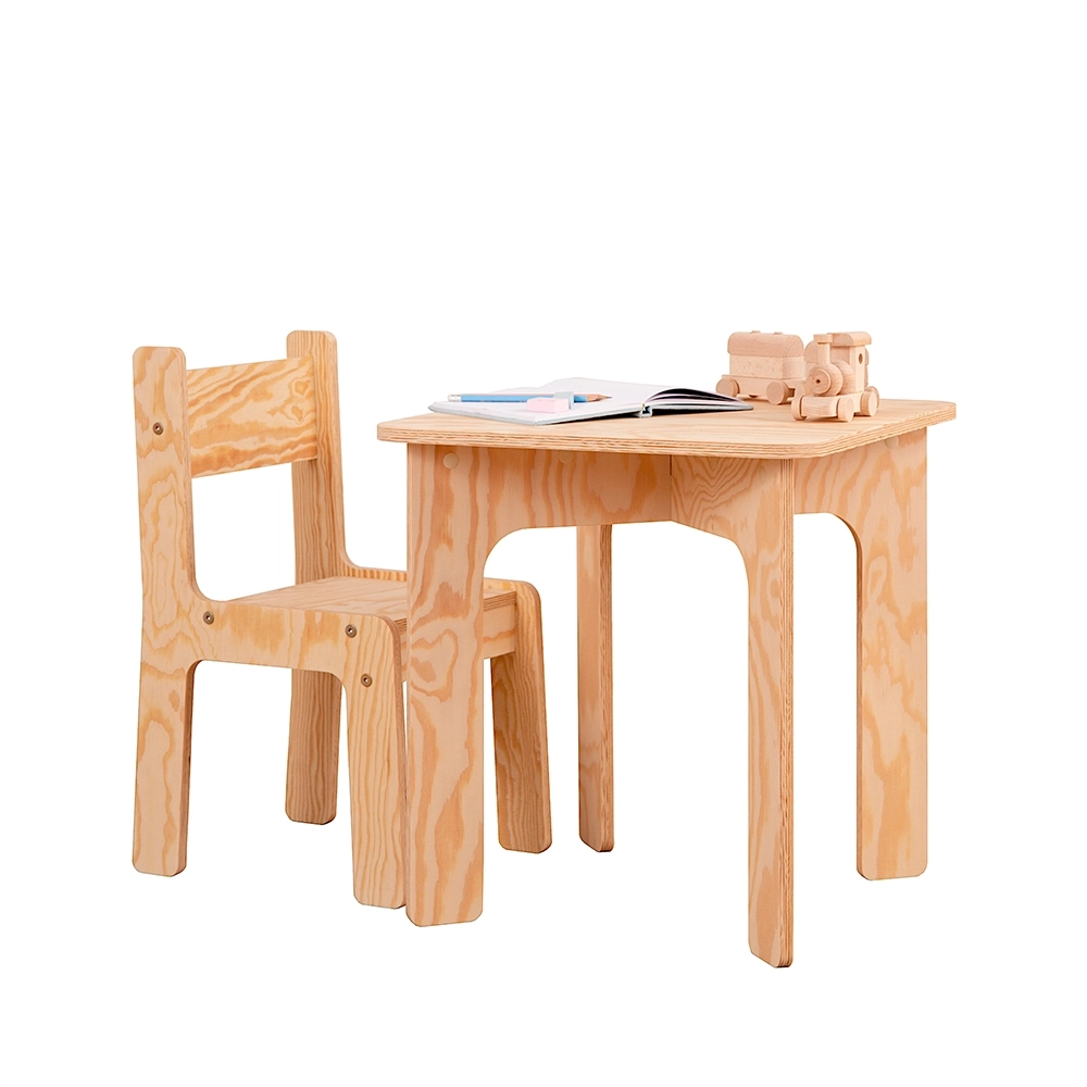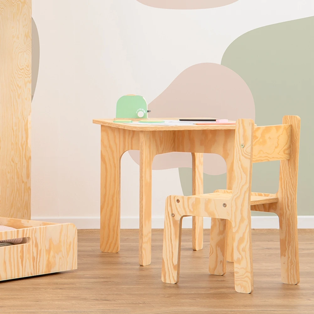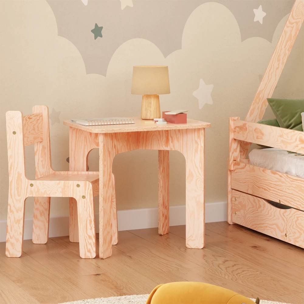 Zestaw drewniany stolik z krzesełkiem jest wykonany z ekologicznej sklejki sosnowej. Ten naturalny materiał stanowi bezpieczny i zdrowy wybór dla środowiska dziecka. Sklejka sosnowa jest wolna od szkodliwych chemikaliów i lotnych związków organicznych, zapewniając czystsze powietrze w pomieszczeniach i zmniejszając narażenie dziecka na alergeny. Trwała, solidna konstrukcja zapewnia bezpieczną i stabilną przestrzeń roboczą dla malucha, a jej jasny kolor i naturalne usłojenie dodają odrobinę ciepła i uroku do pokoju dziecka.